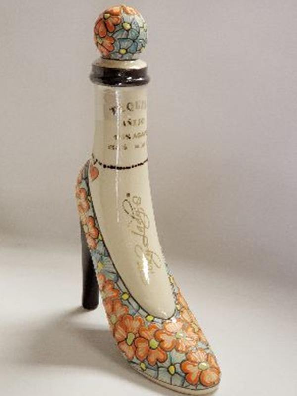 Limited edition, ceramic ladies high heeled-shoe decanter. This very collectible piece is very hard to find; 100% Artisanal, 100% pure agave. Beautiful ceramic hand-made, designed by Sergio Partida.