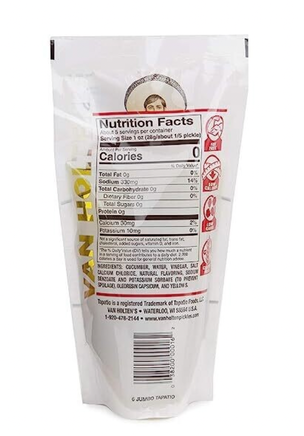 Cucumber, Water, Vinegar, Salt, Calcium chloride, Natural flavoring, Sodium benzoate and potassium sorbate ( to prevent spoilage), Oleoresin capsicum and Yellow 5.